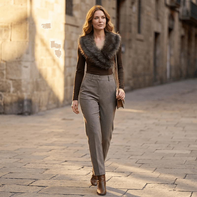 Signature Design: The non-detachable fleece trim adds a luxurious texture contrast against the clean solid colors of Coffee Brown, White, and Black. The cross V-neck creates an elongating effect, enhancing the neckline and collarbone.