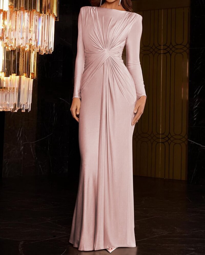 NURO Elegant Long Sleeve Pleated Maxi Evening Gown