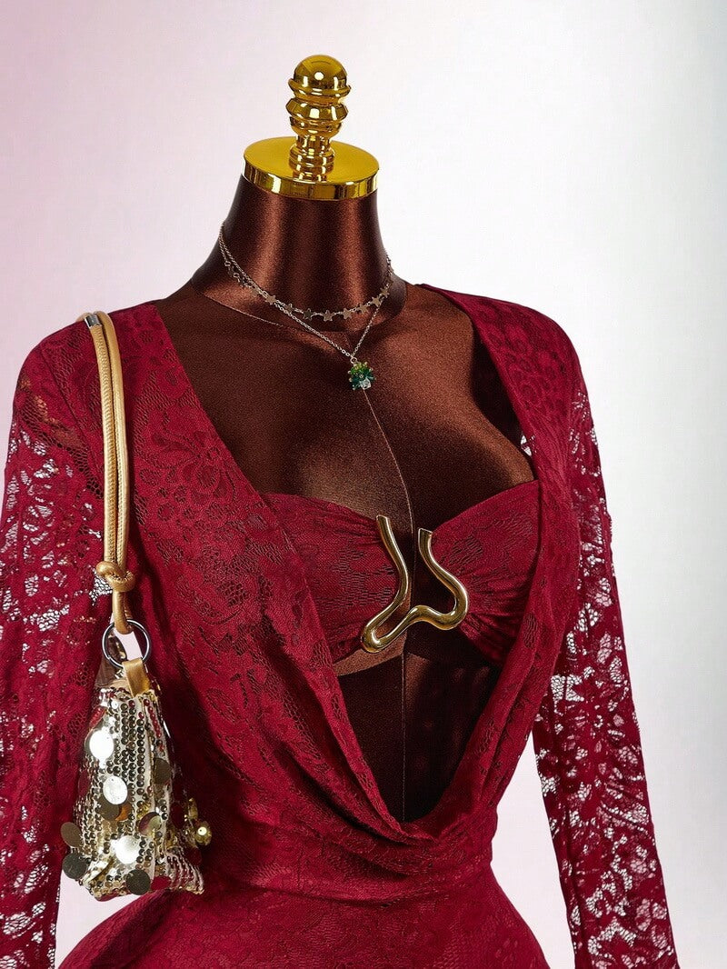 Embrace a bold and elegant look with the NURO Lace Panel Bodycon Mini Dress. This striking dress combines sheer lace panels with a sleek, form-fitting silhouette for a design that is both sensual and sophisticated. The long, flowing bell sleeves add a dramatic touch, while a subtle metallic accent detail elevates the overall aesthetic. Made from a stretchy and breathable polyester blend, this dress offers comfort and a perfect fit that accentuates your curves. With its above-the-knee length and chic design, it's ideal for evening events, parties, date nights, or any occasion where you want to make a stylish statement.