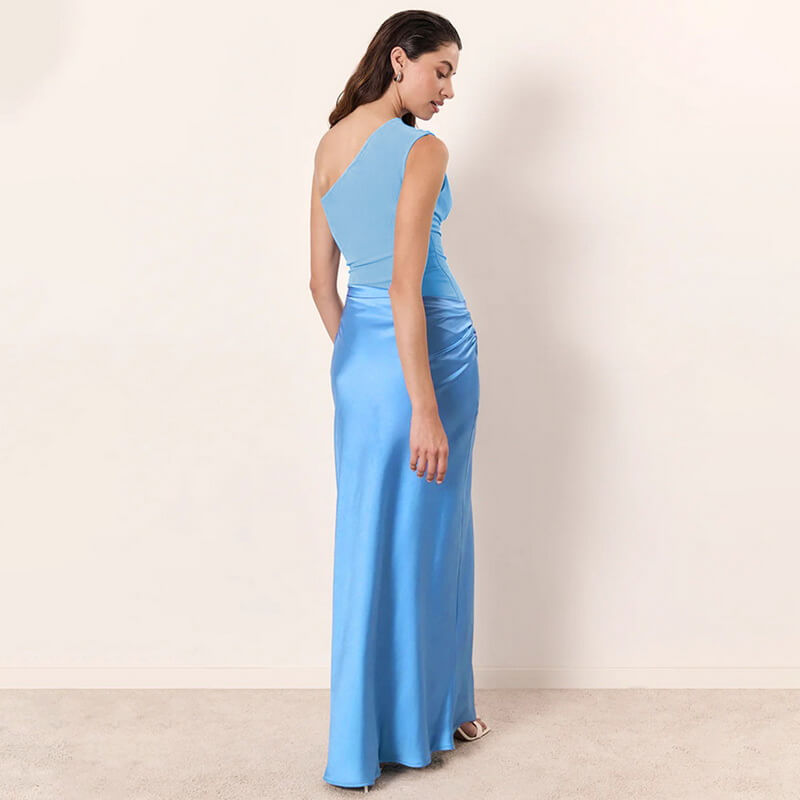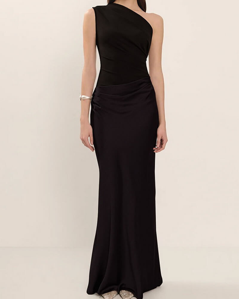 Embrace bold elegance with the NURO Off Shoulder Ruched Maxi Dress. This stunning gown combines a fashionable off-shoulder design with a sleek bodycon silhouette and chic color-blocking accents, enhanced by delicate ruching for added texture and style. Crafted from a premium milk silk blend with high elasticity, it offers both comfort and a polished, figure-hugging fit. Whether you're attending a wedding, a gala, a cocktail party, or any special event, this dress ensures you look confident, glamorous, and utterly unforgettable.