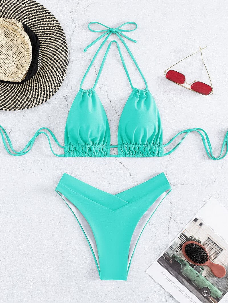 With adjustable straps and ties, you can easily customize the fit to ensure security and comfort during any water activity. The clean, solid color design delivers a sporty yet elegant look that pairs effortlessly with cover-ups and beach accessories. Whether you're hitting the waves, lounging by the pool, or enjoying a tropical getaway, this bikini combines performance with style.