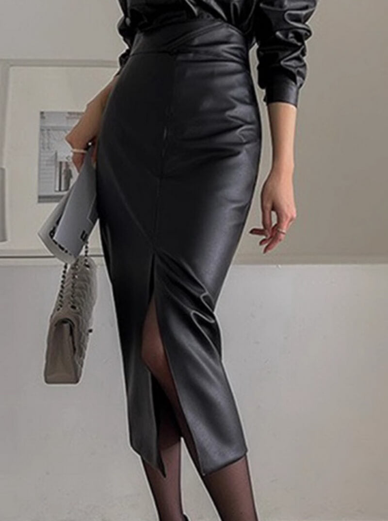 Elevate your professional or evening look with this sleek PU leather pencil skirt, designed with a modern side slit for added movement and style. Made from smooth, non-stretch PU leather, this skirt offers a structured, body-hugging fit that accentuates your curves. The high-waist design and midi length create a polished silhouette, perfect for the office, dinner dates, or nights out. Pair it with blouses, fitted tops, or chic sweaters for a sophisticated, confident outfit.