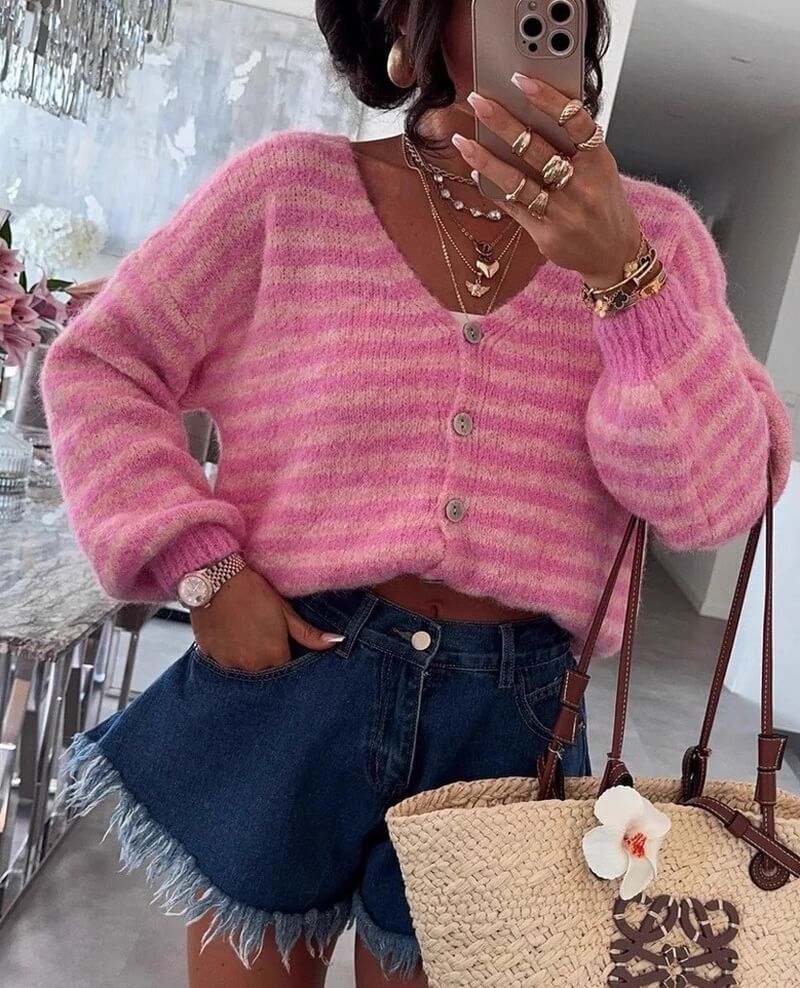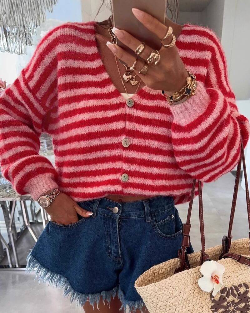 Elevate your casual wardrobe with the NURO Striped Patchwork Cardigan. This unique knit cardigan combines a classic striped design with modern patchwork elements, creating a standout piece that’s both stylish and functional. Crafted from soft polyester, it offers lightweight warmth and a comfortable feel. The V-neckline and three-quarter sleeves provide a flattering fit, while the button-front closure makes it easy to wear open or closed. Whether paired with jeans for a relaxed look or layered over a dress for added style, this cardigan adds personality and comfort to any outfit.