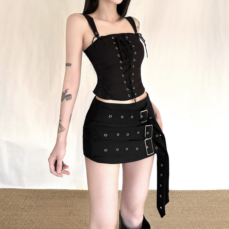 MATCHING MINI SKIRT: Paired with a coordinating high-waist mini skirt for a complete, head-to-toe ensemble.