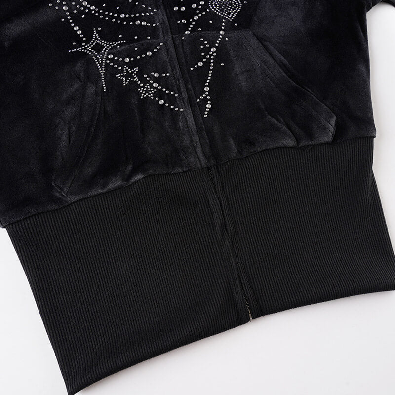 Embrace edgy elegance with the NURO Abstract Print Velvet Hooded Zip Up Jacket. This standout piece combines plush velvet fabric with eye-catching abstract patterns, rhinestone accents, and a cozy faux fur-lined hood. Designed with a cropped length and slim fit, this jacket is perfect for making a bold fashion statement in any setting.