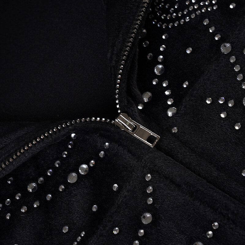 Made of soft velvet fabric with abstract print and rhinestone detailing for a bold, unique look.