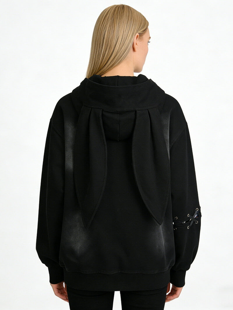 NURO Women's Bunny Ear Hooded Zip-Up Sweatshirt, Retro Streetwear Style Cardigan