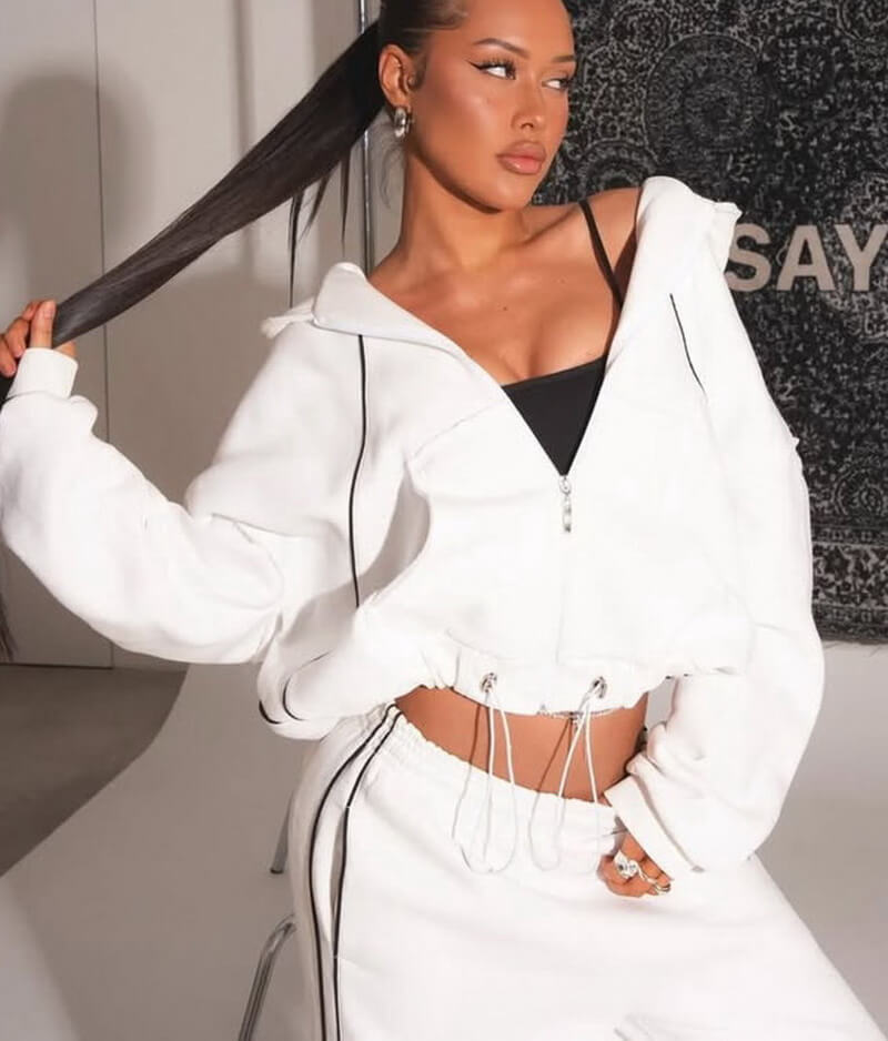 This matching set includes a zip-up hoodie and straight-leg pants, designed with color-block lines and tie accents for a clean yet fashionable look. Crafted from high-content polyester, it’s soft, breathable, and durable—perfect for autumn everyday wear.