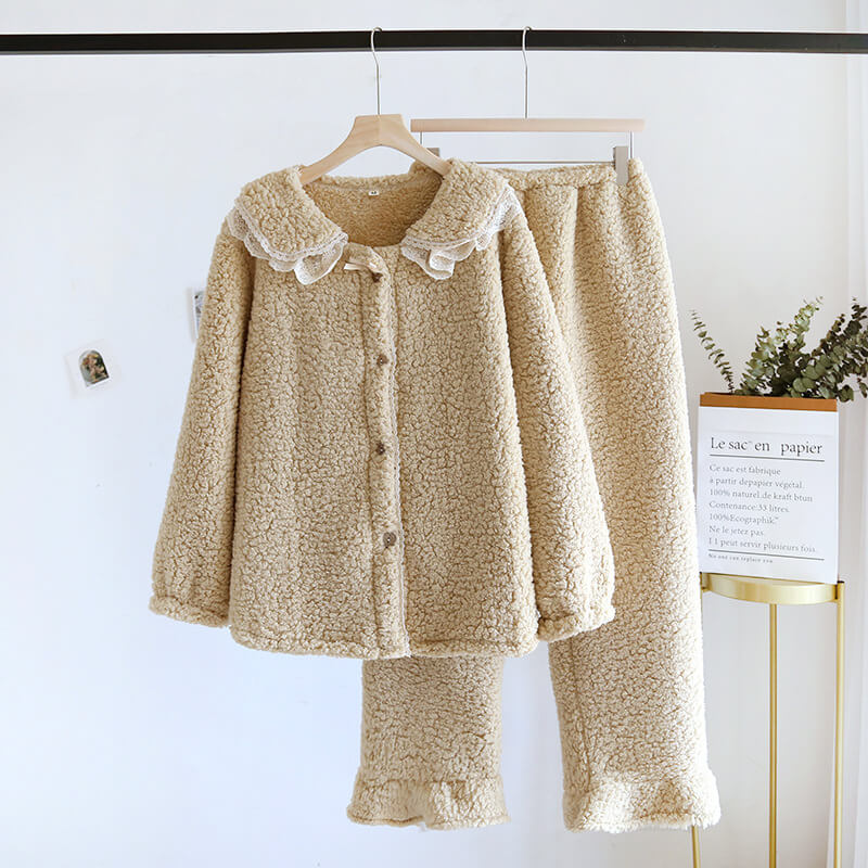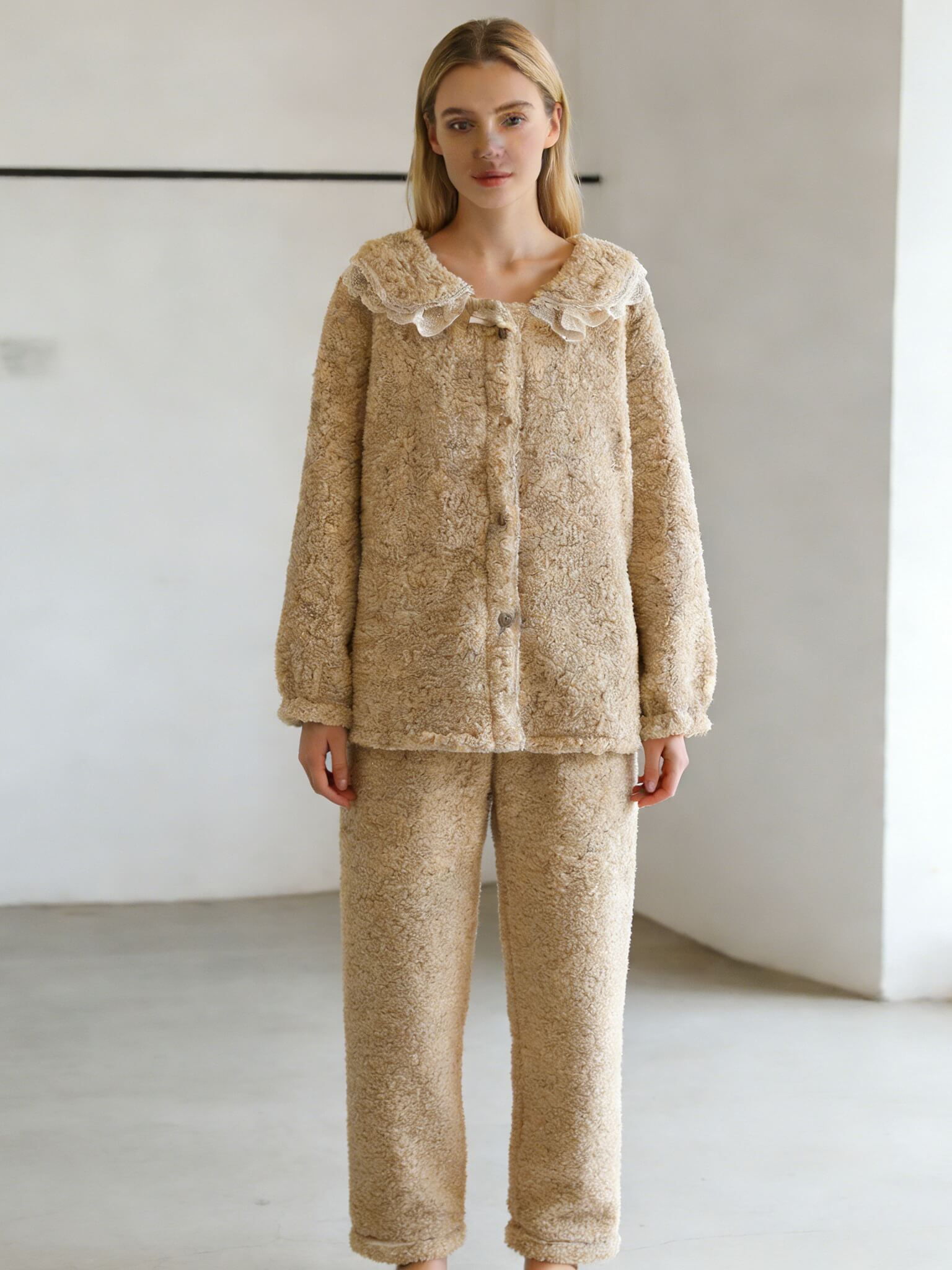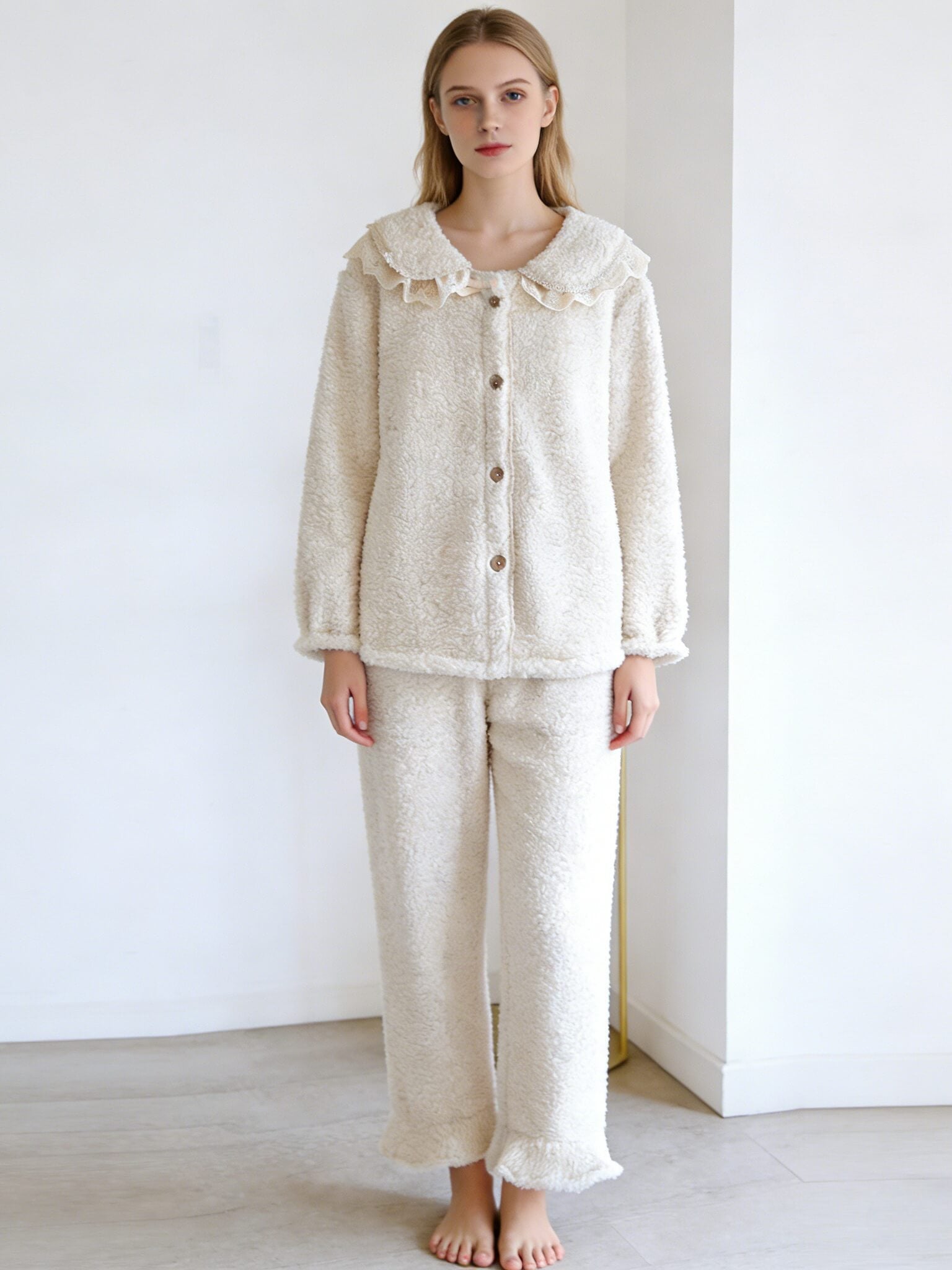 Complete Two-Piece Set: Includes a long sleeve top with a decorative collar and matching long pants, designed for comfortable and warm full-body coverage at home or for casual outdoor wear.