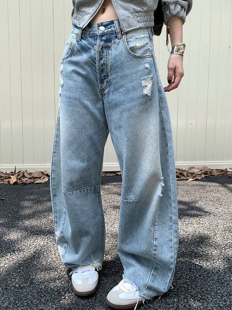 NURO Women's Distressed Wide Leg Jeans, Curved Hem Baggy Denim Pants with Destroyed Details, Vintage Wash Light Blue Streetwear