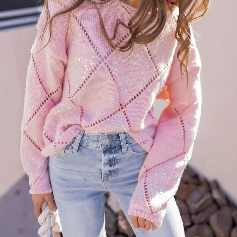 This sweater is designed for the modern lifestyle that blends activities. Wear it with high-waisted jeans and sneakers for a stylish daytime look, or pair it with leather pants and boots for an edgier evening outfit. The sequin details catch the light beautifully, making it suitable for dinners or casual gatherings.