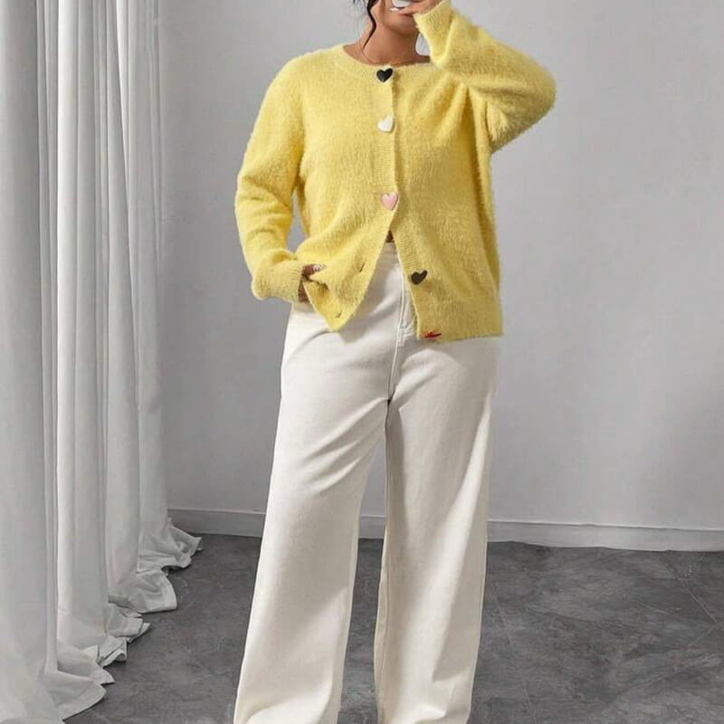 The defining feature is the row of delicate heart-shaped buttons. This playful detail injects personality and a subtle romantic flair into the design, transforming a simple cardigan into a conversation piece. It’s a small touch that makes a big impact on the overall aesthetic.