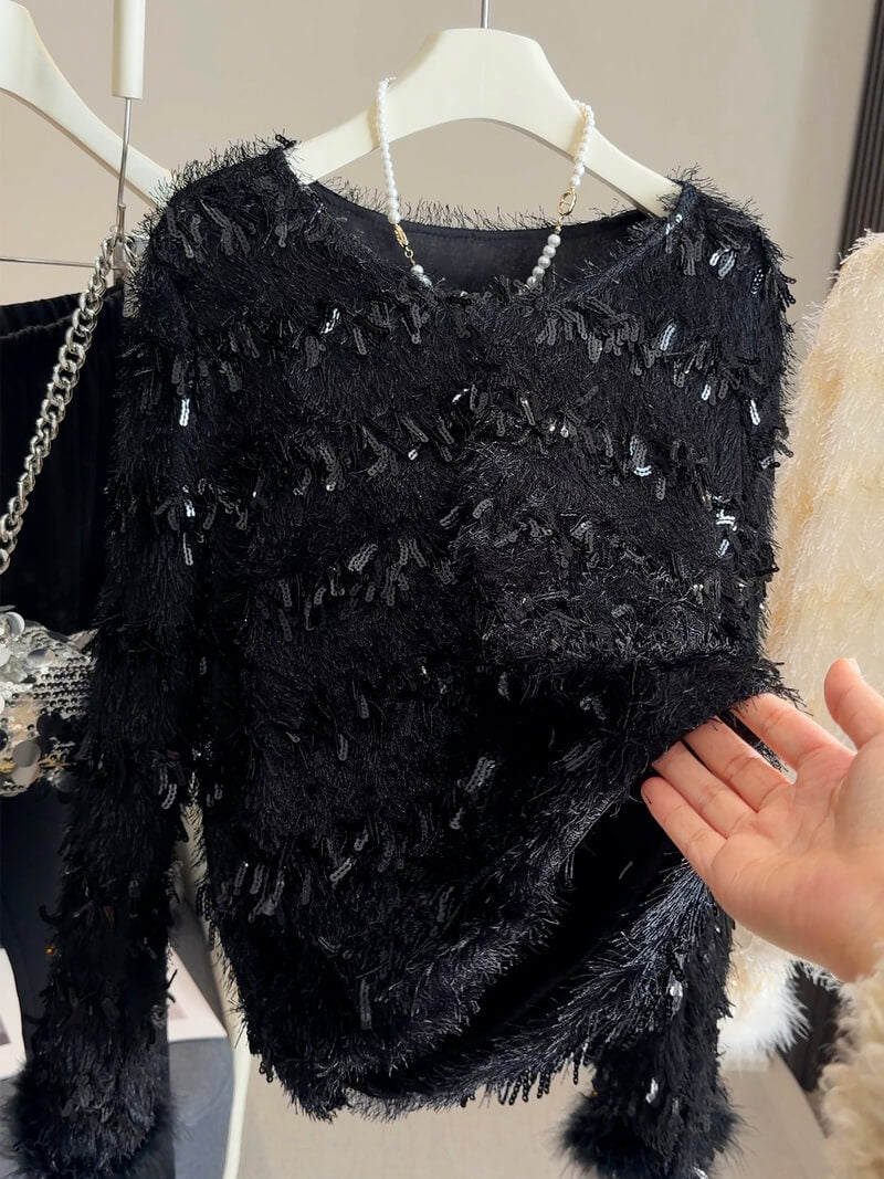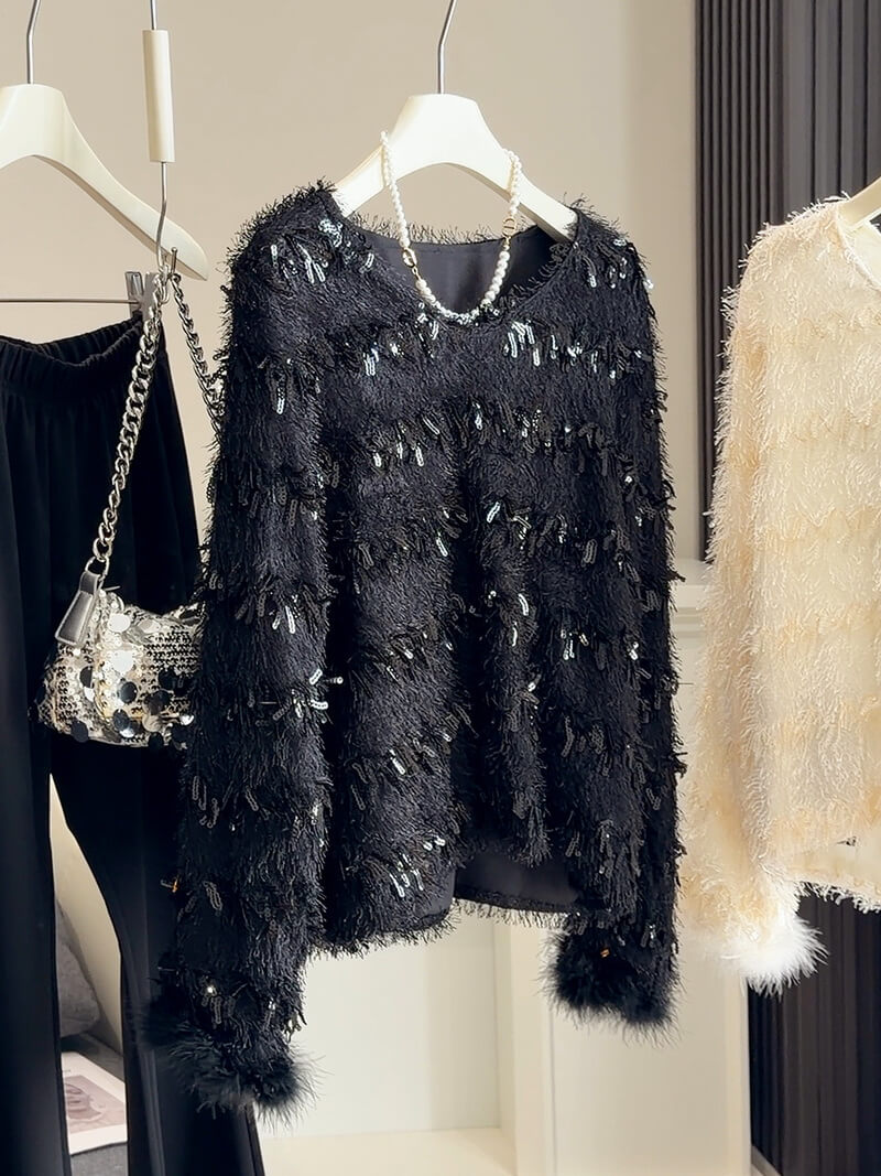Add a touch of playful elegance to your wardrobe with NURO's fringe hem lace top. This cropped blouse combines sheer lace sleeves with a soft knit body and a stylish fringe hem, creating a look that’s both feminine and modern. Designed with a flattering cropped length, it’s perfect for pairing with high-waisted skirts, pants, or jeans for a chic and balanced silhouette.