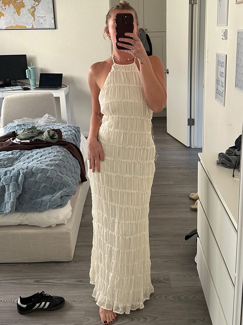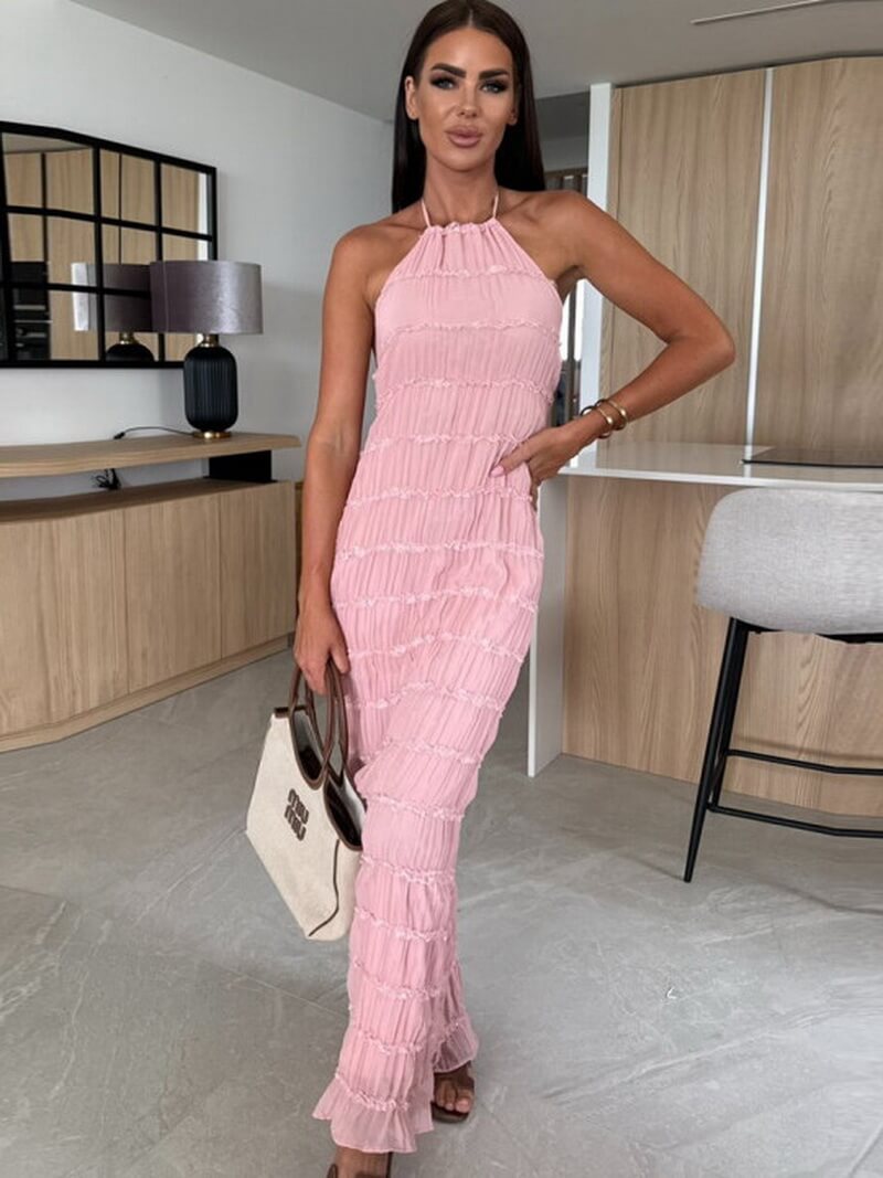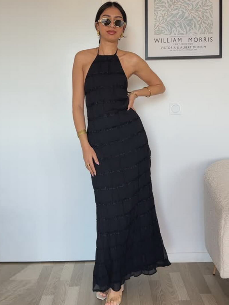 Elevate your summer wardrobe with the NURO Halter Neck Ruffle Detail Maxi Dress. This elegant floor-length dress features a chic halter neckline with an adjustable tie-back design, offering a customizable and flattering fit. The lightweight fabric and delicate ruffle detailing along the hem and sleeves create a soft, feminine silhouette. With a comfortable elastic waist and a subtle side slit, this dress combines style and ease, making it perfect for daytime outings, beach vacations, garden parties, or any occasion where you want to look effortlessly beautiful.
