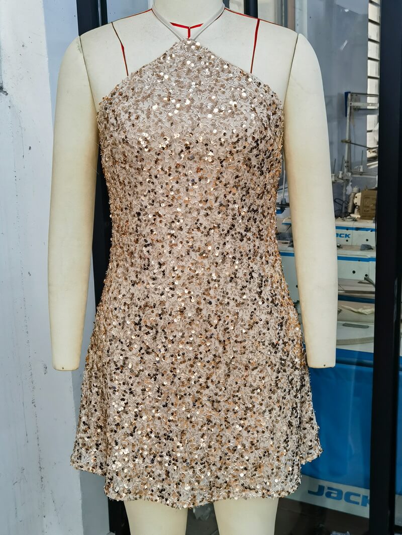 halter neck dress, sequin dress, cocktail dress, mini dress, nightclub dress, party dress, evening dress, A-line dress, sleeveless dress, women's occasion wear, sparkly dress, sexy dress, elegant dress, holiday dress
