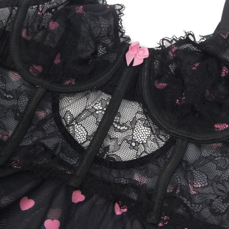 Features a charming heart print design with delicate lace mesh and a sweet bow accent for a playful, romantic look.