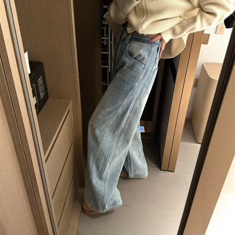 Embrace warmth and unique style with NURO's embellished wide leg jeans—where detail meets winter practicality.
