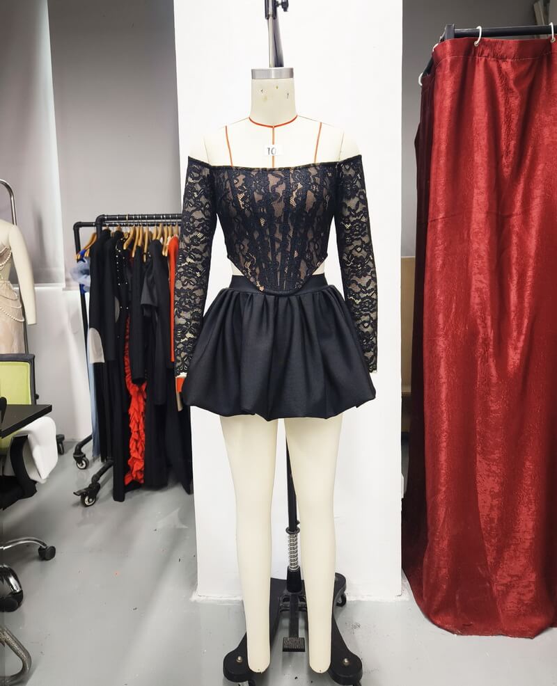 Two-Piece Set: Includes an off-shoulder long sleeve lace top and a matching bandage-style mini skirt for a coordinated, statement-making ensemble.