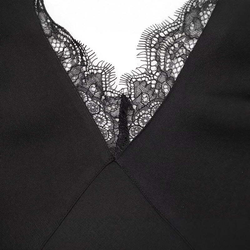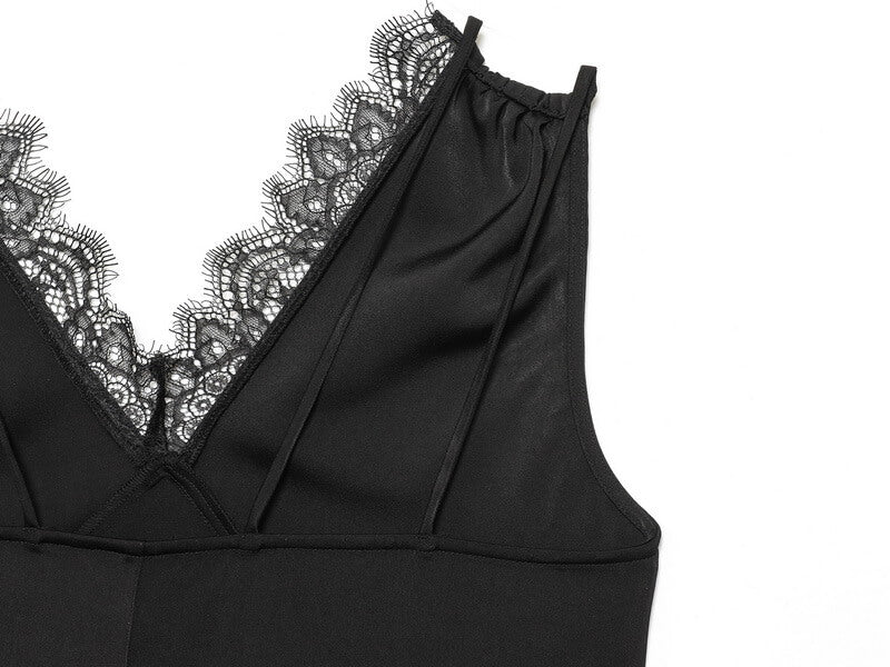 Chic two-piece set features a delicate lace trim tank top and matching A-line midi skirt.