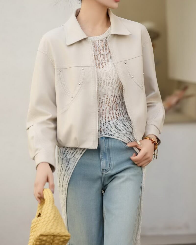 - Timeless Biker Style: Features a classic moto silhouette with a cropped length, a sharp turn-down collar, and snap-button cuffs for a sleek, modern finish.