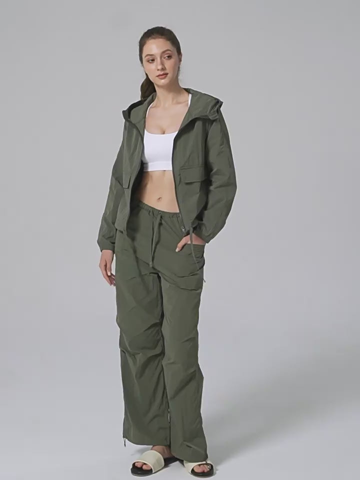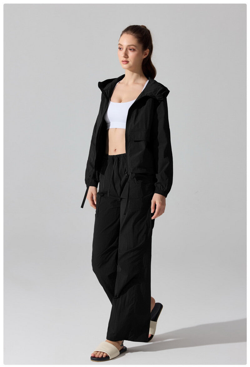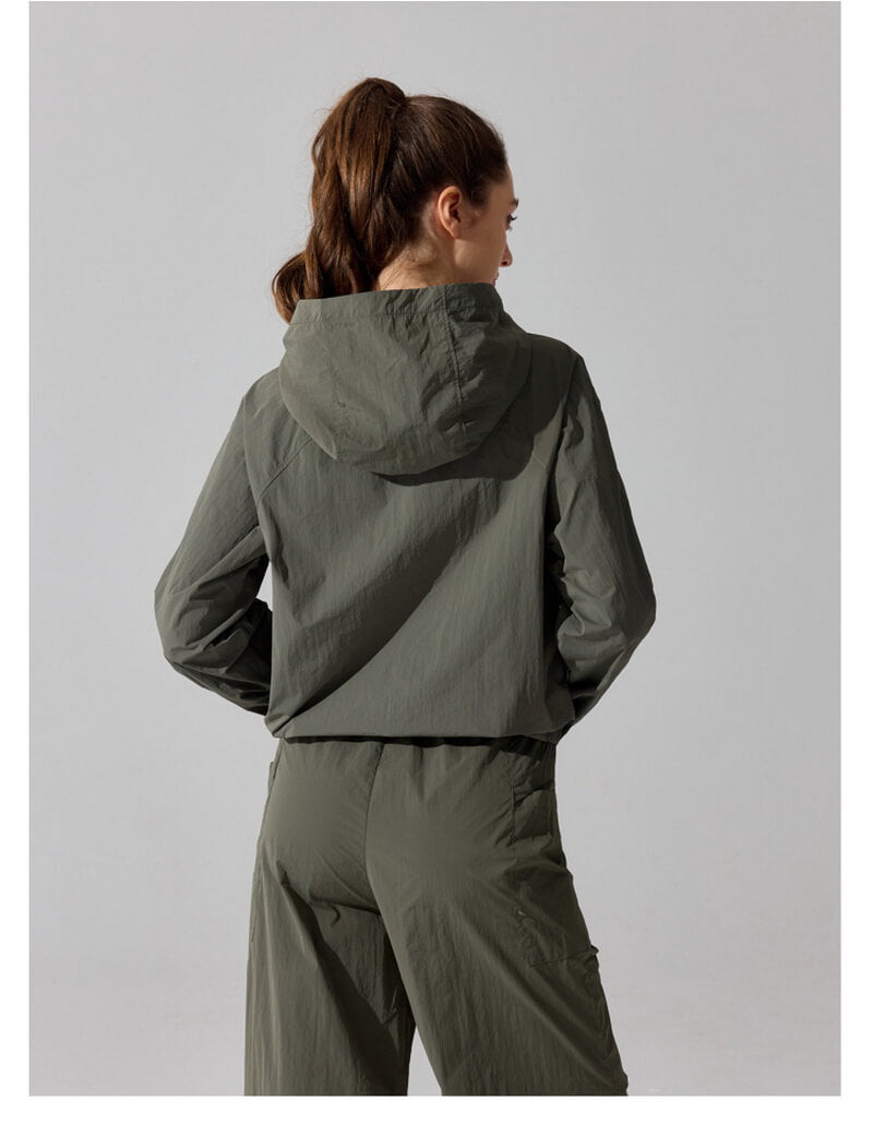 Embrace adventure in style with the NURO Women's Lightweight Windproof Sun Hoodie. This versatile jacket is designed for ultimate protection and comfort during outdoor activities. Featuring a soft, crinkled nylon fabric, it provides reliable wind resistance, water-repellency, and UPF sun protection. The relaxed, loose fit and adjustable hood offer full coverage and a casual, laid-back look, perfect for hiking, running, travel, or as a chic cover-up over yoga wear. Lightweight and packable, it's your essential go-to layer for unpredictable weather and sun exposure, blending seamlessly with any active or casual outfit.