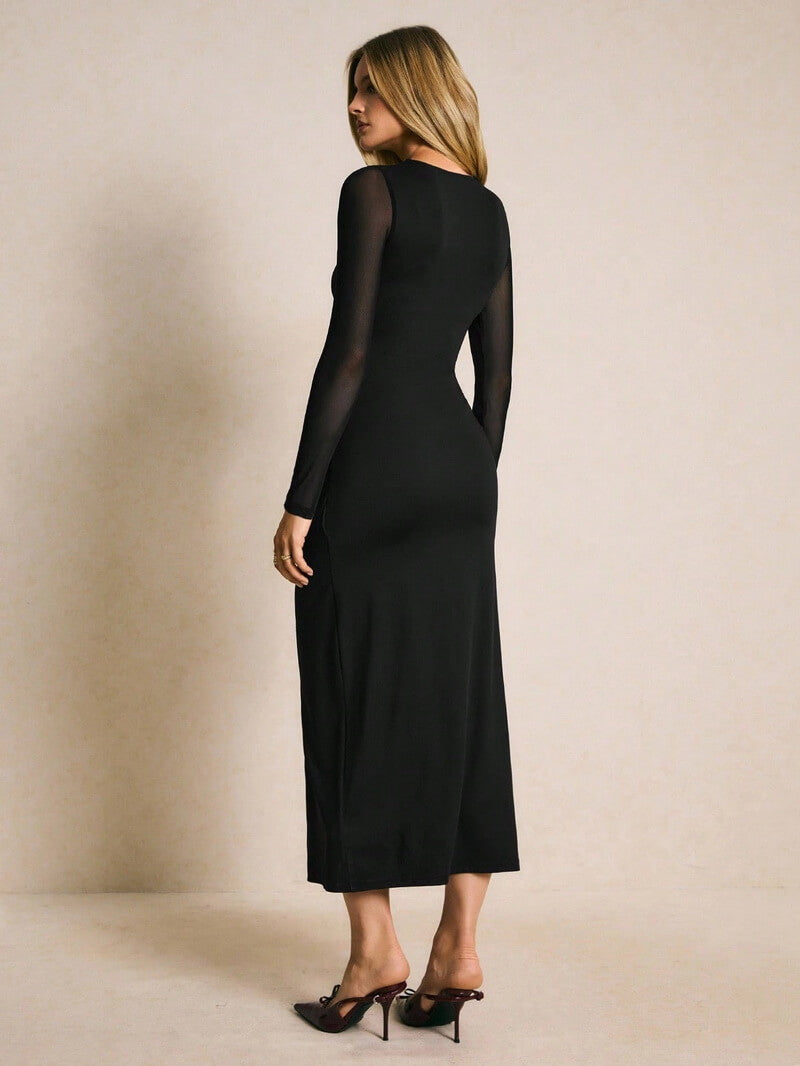 Step into timeless elegance with the NURO Mesh Sleeve Bodycon Maxi Dress. This stunning dress combines a sleek knit body with sophisticated mesh sleeves, adorned with metallic button details for a touch of modern luxury. Designed with a high neckline and a form-fitting silhouette, it accentuates your curves while offering a refined and polished look. The floor-length design and high waist create an elongating effect, making it perfect for formal events, evening galas, or any occasion where you want to make a memorable impression.