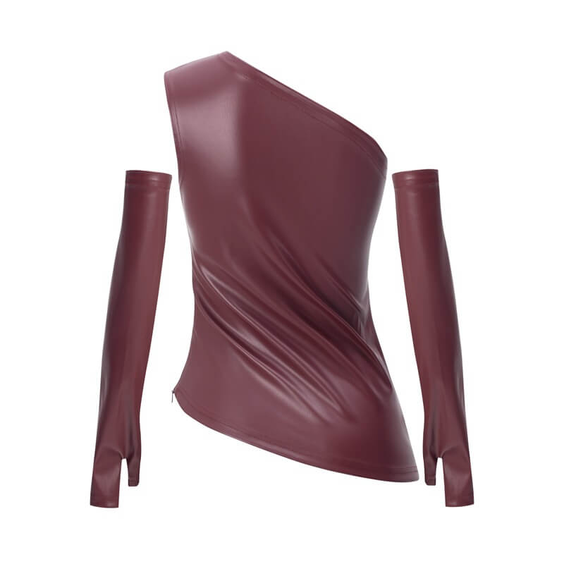 Elevate your streetwear game with NURO's Off-Shoulder PU Leather Sleeve Top. Designed for the fashion-forward individual, this cropped cami combines an asymmetric off-shoulder cut with removable sleeve accents for a look that’s both bold and customizable.