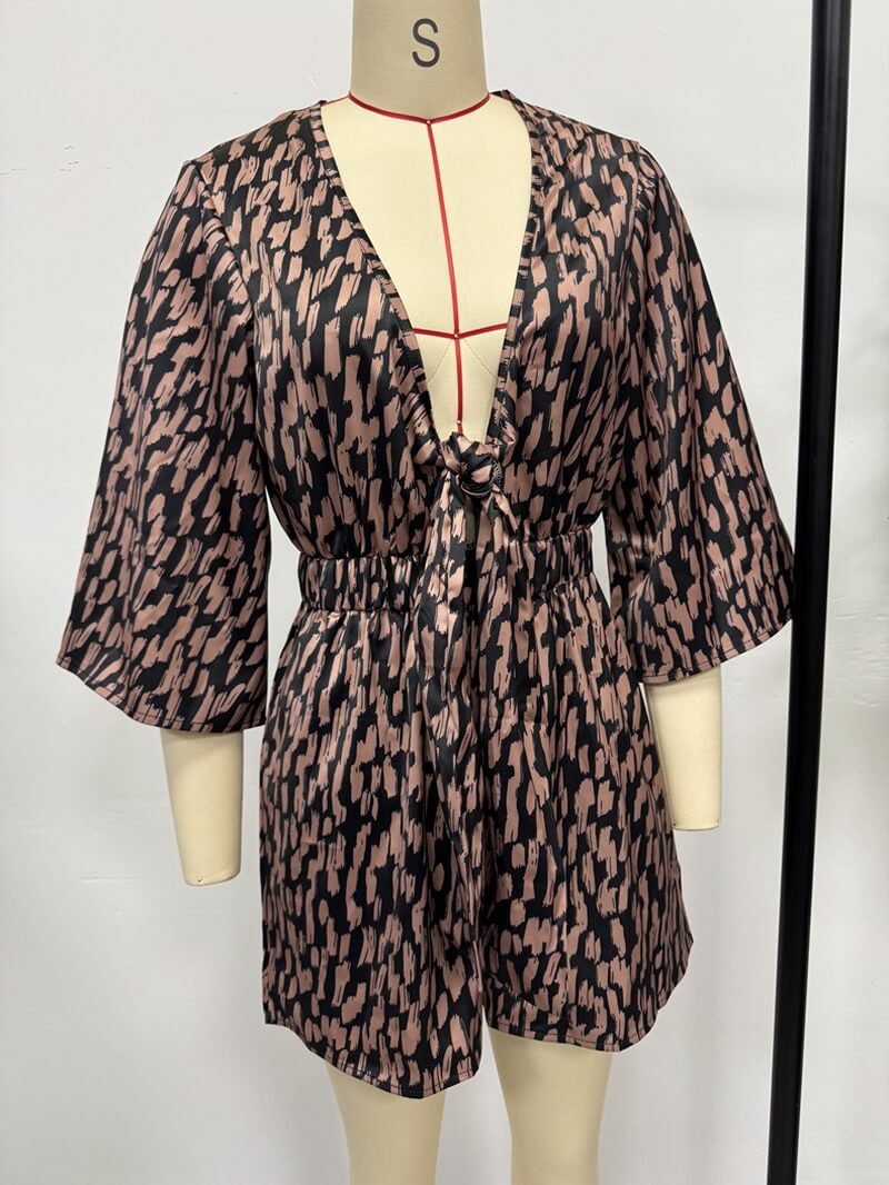 Design: All-Over Print, Wide Leg, High Waist, V-Neck, Three-Quarter Sleeve, Jumpsuit