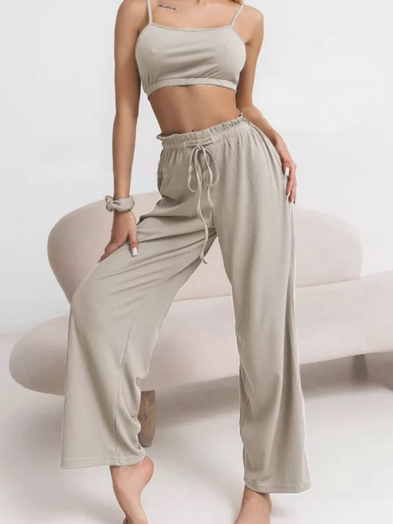 Versatile 3-Piece Design: Includes a sleeveless U-neck top, a long sleeve open cardigan, and matching long pants, providing flexible layering options for home or casual outings.