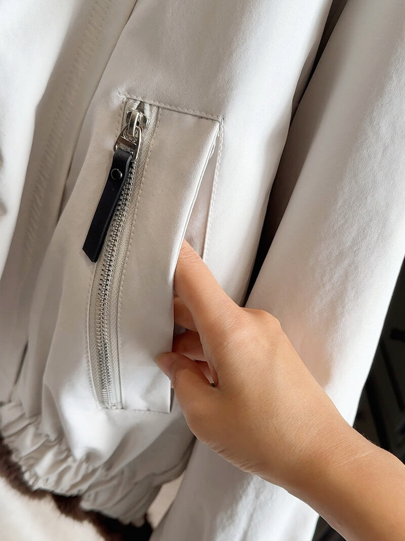Perfect for transitioning between casual and dressed-up occasions, this jacket features practical side pockets and a regular length that pairs well with jeans, leggings, or skirts. The neutral beige tone ensures it complements a wide range of outfits, while the reversible design allows you to refresh your look without changing coats.