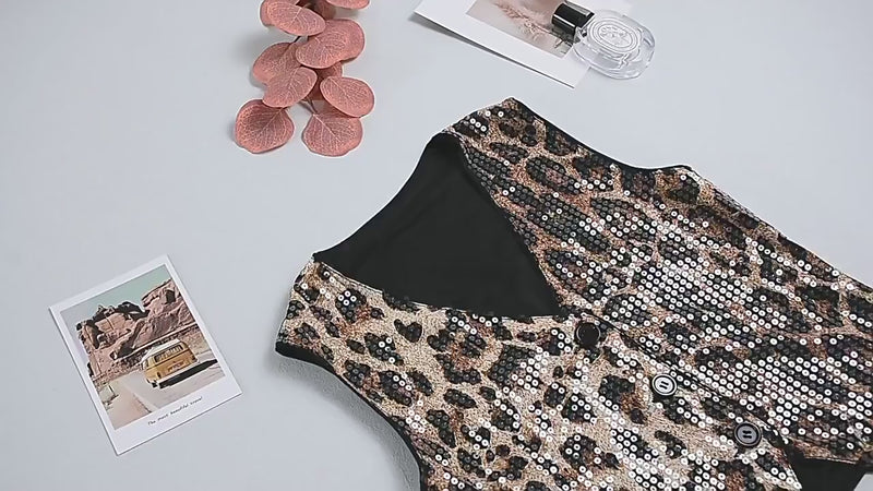 NURO Women's Sequin Leopard Print Cardigan Vest - V-Neck, Button Front, Fitted Sleeveless Top, Streetwear