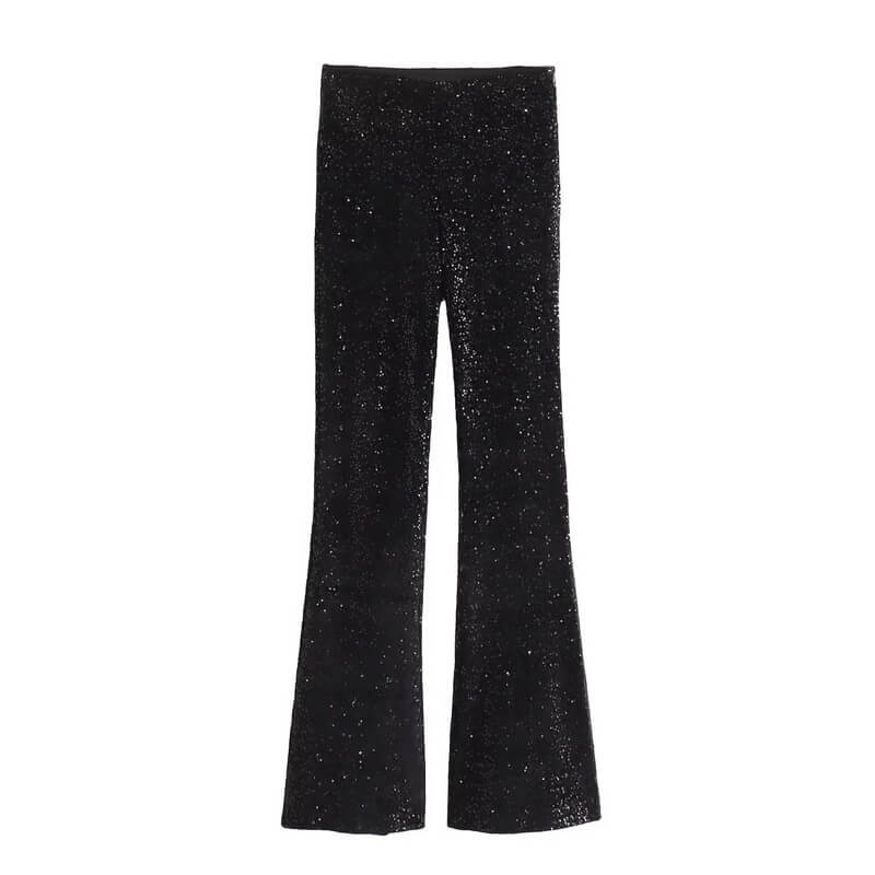 Stylish two-piece set featuring a sequined off-shoulder crop top and matching wide-leg trousers.
