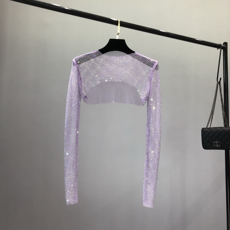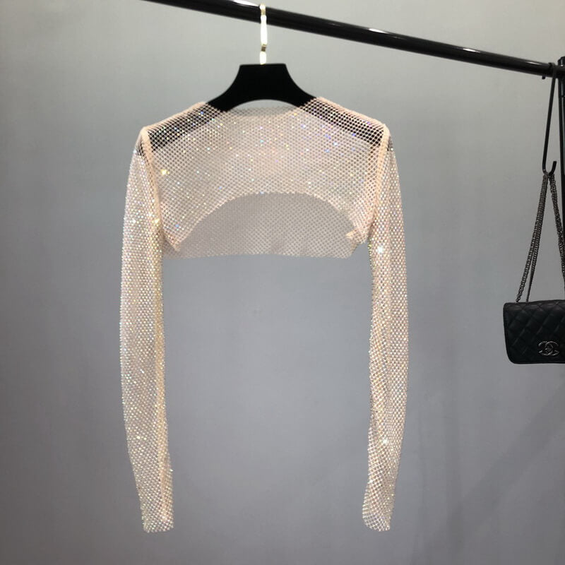 Add a touch of elegance and sparkle to any outfit with the NURO Sheer Mesh Long Sleeve Bolero. This delicate shrug top features a sheer mesh fabric adorned with shimmering rhinestone trim, creating a luxurious layered look. Designed with a cropped fit and long sleeves, it’s perfect for draping over dresses, tank tops, or camisoles for a hint of coverage and glamour. Ideal for summer evenings, weddings, parties, or adding a chic finishing touch to your ensemble.