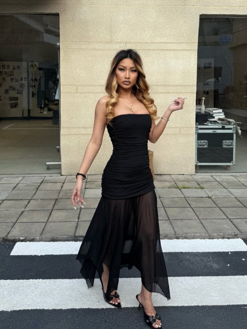 Sleek & Sexy Strapless Design: This elegant dress features a modern strapless neckline with a ruched bodice and sheer mesh panel inserts, creating a daring yet sophisticated silhouette perfect for evening glamour.