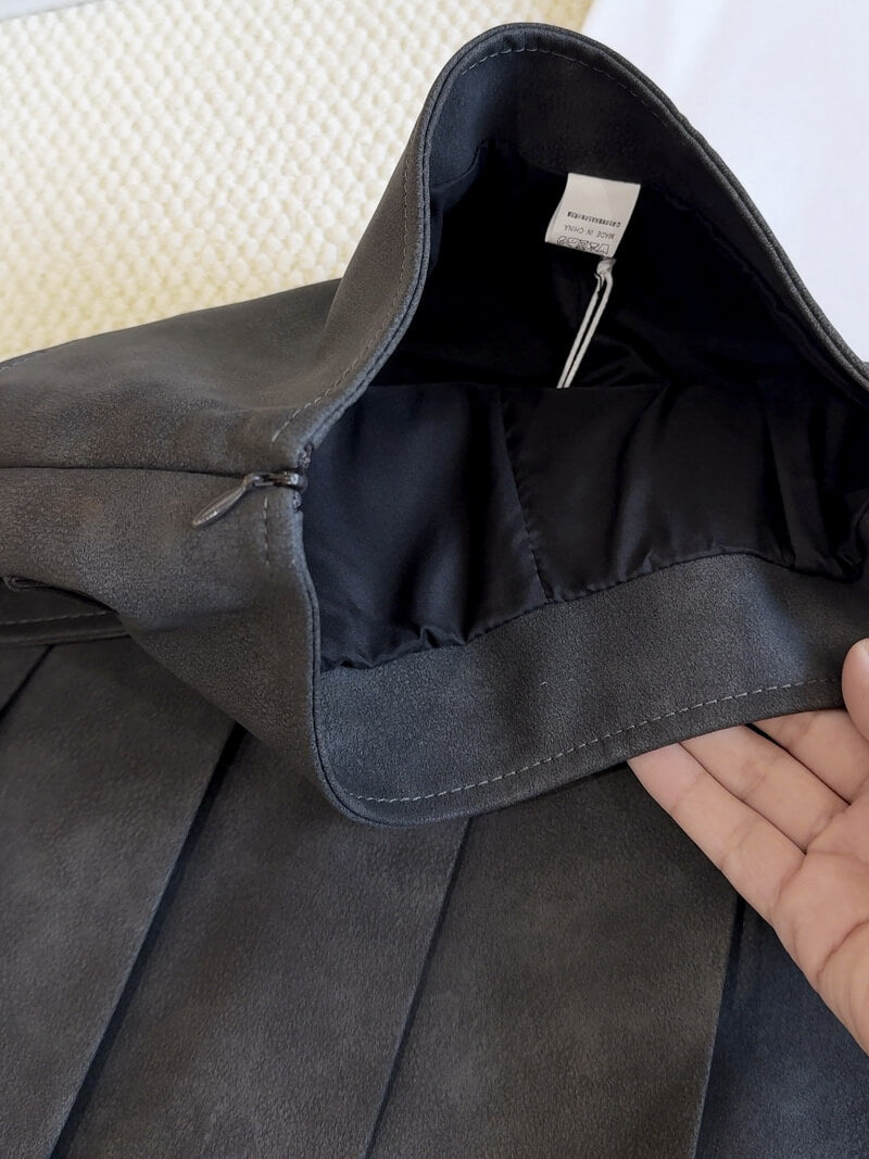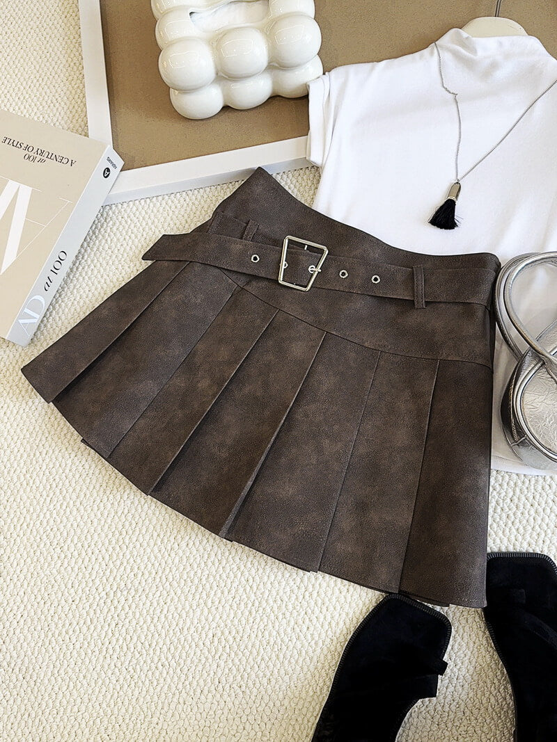 Perfect for fall/winter layering, this skirt pairs beautifully with cozy sweaters, fitted tops, or oversized jackets. The diagonal belt detail adds a touch of modern flair, while the durable PU leather ensures you stay stylish through every season.