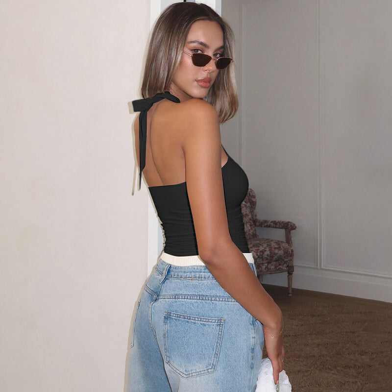 Adjustable Back Tie & Twist Knot Detail: Features a stylish twist knot design at the front and an adjustable crisscross tie-back for a customizable, sexy open-back look.