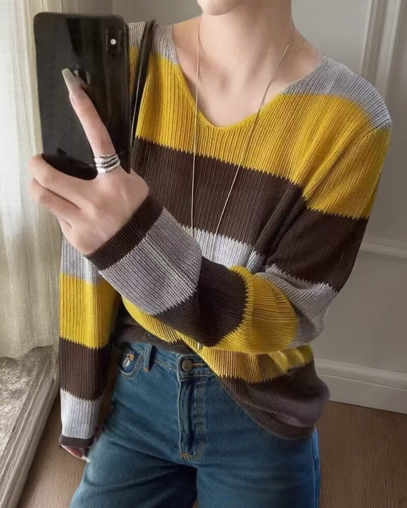 NURO Women's V-Neck Color Block Striped Knit Top – Playful & Modern Layering Essential