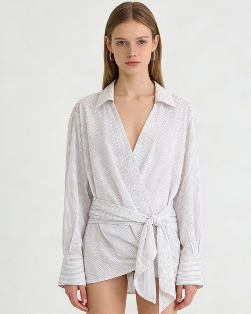 Style: Blouse, Button-Down, Striped, Long Sleeve, Waist Tie