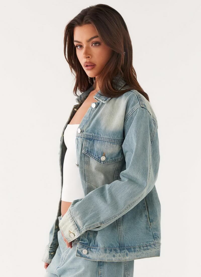 Coordinated denim jacket and pants set for a cohesive, sophisticated look