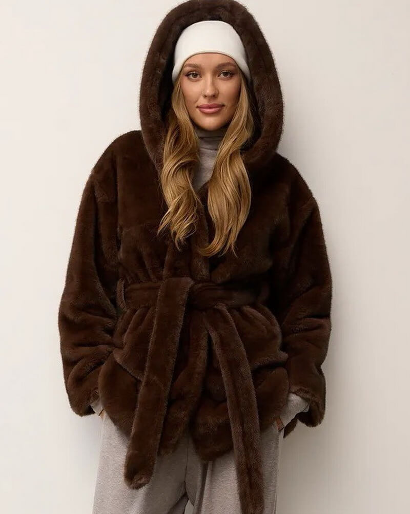 Women's Mid-Length Faux Mink Fur Coat, Hooded Belted Teddy Jacket, Casual Outerwear for Winter Commute